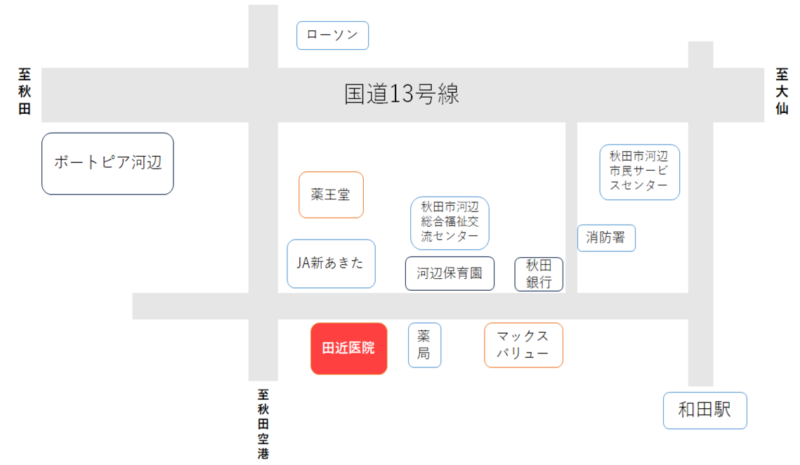 医療法人 田近医院〒019-2625 秋田県秋田市河辺北野田高屋字上前田表76の1TEL.018-882-3123FAX.018-882-2377Google マップを見る